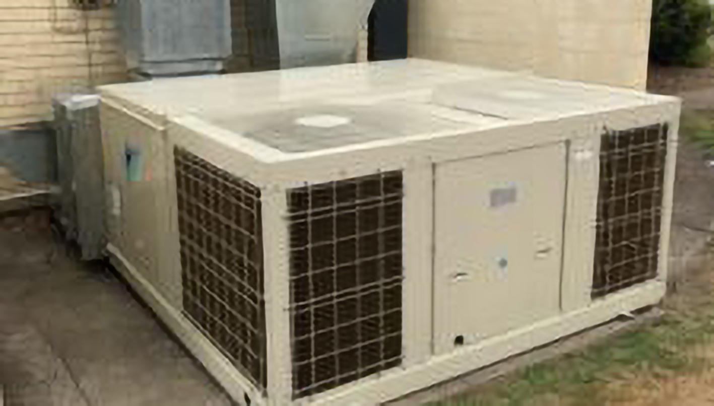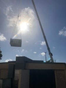 Due to the location of the outdoor unit, we had to crane lift the unit over the administration building on a weekend.